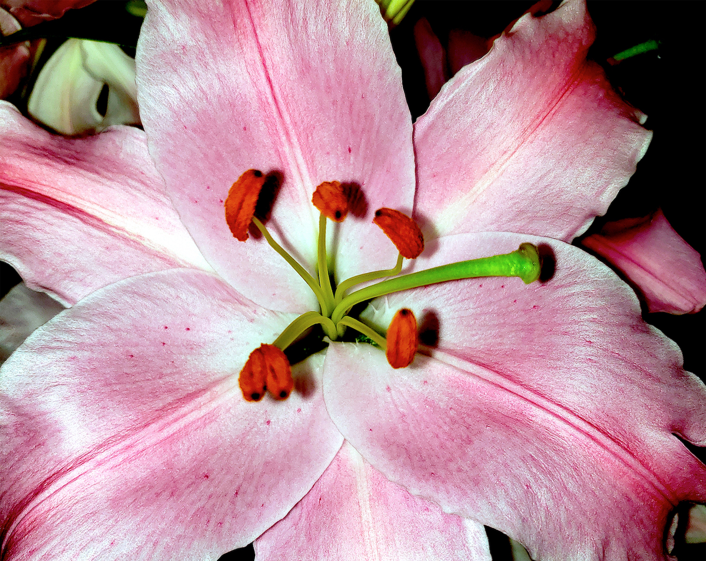 The stargazer lily will fill your home with the most glorious scent – maybe you already know that. The long part leaning to the right is called the pistil – the female part. The brown parts surrounding the pistil are the stamen – the male parts. Those brown hats topping the stamen are called the anther. As the flower ages, this anther sprinkles all over the place, making a mess. The scent is worth it though. Not to mention the absolute beauty of this flower.